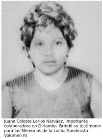 Juana Celeste Larios Narváez nace en Rivas el 6 de mayo de 1938, pero en su cédula –por reposición de partida de nacimiento–, aparece como nacida en 1942, en Diriamba. Es hija de Luis Larios Rivera y Luisa Narváez Rocha. Estudia secretariado ejecutivo y se gradúa en 1957. Su cuñado Óscar Rivas –esposo de su hermana Dora–en 1974 la recluta para el Frente Sandinista de Liberación Nacional (FSLN).